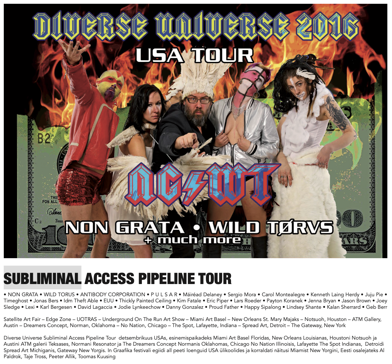 Non Grata organiseeritav Diverse Universe Festival toimub detsembrikuus USAs, esinemispaikadeks Miami Art Basel Floridas, New Orleans Louisianas, Houstoni Notsuoh ja Austini ATM galerii Teksases, Normani Resonator ja The Dreamers Place Oklahomas, Chicago No Nation Illinoisis, Lafayette The Spot Indianas,  Detroidi Spread Art Michiganis, Gateway New Yorgis. Ajal, kui Ameerika on Euroopa kultuuri- ja uusvasakpoolsetes ringkondades täiesti out ja kogu maailma kurjus ja allakäik delegeeritakse ühendriiklaste iivlpresidendi kaela, kipub euraasias ununema fakt, et valdav osa maailma alternatiivkultuuri pärlitest pärineb just sellest keskkonnast. Ja midagi ei ole muutunud – alternatiivne mõtlemine ja kodanikualgatus produtseerib läänepoolkera lõpmatutes avarustes ennenägematuid eripalgelisi kooslusi, millest eurostandardiseerunul õhtumaal undki ei osata näha.